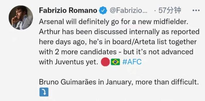 罗马诺称,阿森纳肯定会物色一名新的中场球员。正如几天前报道的那样,阿图尔已经在董事会内部被讨论过了,他和另外两个人选在董事会和阿尔特塔的引援名单上,但球队还没有和尤文接触。