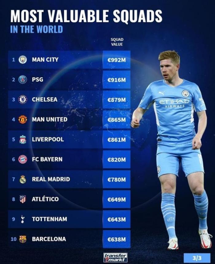 24直播网01月09日讯 ,德转更新了当今世界足坛最新的球队身价榜,曼城9.92亿欧元高榜首,巴黎9.16亿欧元位居第二,前五中有4支英超的球队。