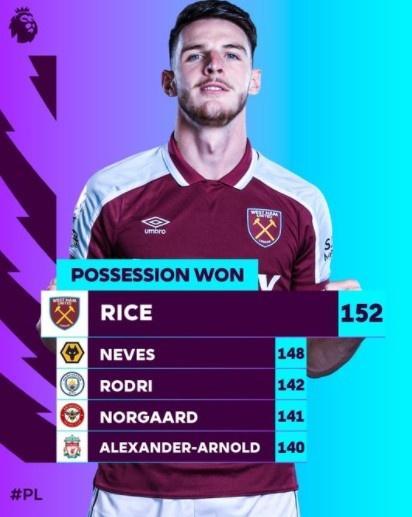 24直播网01月08日讯 英超官方统计了本赛季夺回球权次数最多的球员,西汉姆联的赖斯高居榜首,达到了152次。