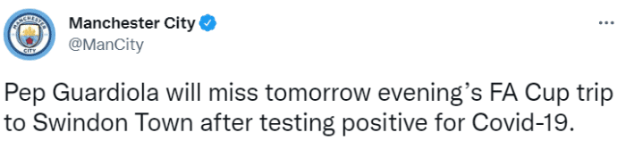 在最新一次核酸检测呈阳性后,瓜迪奥拉将会缺席明晚球队与斯文登的足总杯比赛。