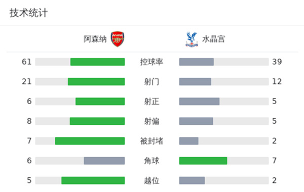 最终阿森纳5比0水晶宫距榜首2分。