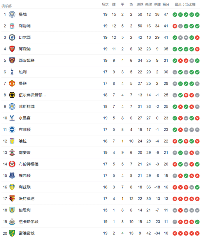 目前英超前五的球队都踢了19轮比赛,曼城47分领跑,利物浦和切尔西同积41分分列二三,阿森纳35分第四,西汉姆31分第五。