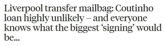 TA表示,巴萨希望在冬窗清洗库蒂尼奥,虽然巴西人曾经在安菲尔德表现出色,但是他租借重返利物浦是不太可能的。