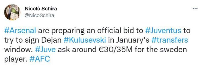 斯基拉表示,阿森纳希望在冬窗补强进攻线,他们将在1月正式向尤文报价库卢塞夫斯基,尤文方面的要价将会是3000-3500万欧元。