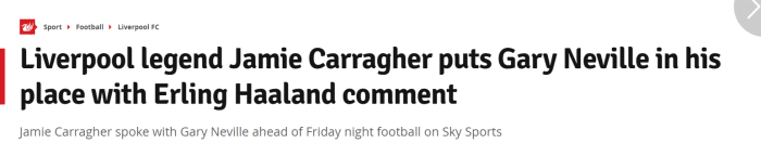 24直播网12月11日讯 据英国媒体《利物浦回声报》报道,拉伊奥拉在此前接受采访时谈到了哈兰德的潜在下家,其中不包括曼联和利物浦,这引发了曼联名宿加里-内维尔和利物浦名宿卡拉格的互相调侃。