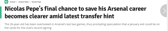 该媒体表示,接下来两场比赛会是佩佩拯救自己阿森纳生涯的最后机会,由于史密斯-罗和马丁内利的伤势,阿尔特塔可能会让佩佩出战与南安普顿及西汉姆联的比赛。不过,目前佩佩本人已经对自己的处境很不满,他希望冬窗租借离队。