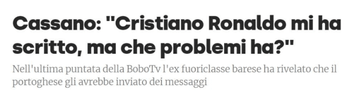 卡萨诺说:“我曾在节目里说C罗不如罗纳尔多,当时C罗还效力于尤文,然后他就给我发来信息,告诉我要尊重他,尊重他取得的成就。”