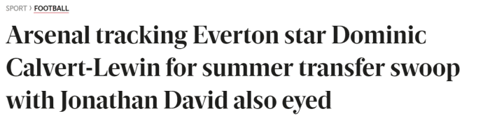 24直播网12月04日讯 据伦敦当地媒体《伦敦晚旗报》报道,阿森纳有意在明年夏天签下卡尔沃特-勒温和乔纳森-戴维来补强锋线。