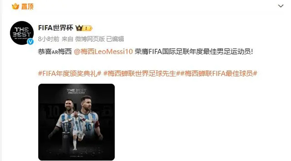 24直播网01月16日讯 凌晨,2023国际足联颁奖典礼在伦敦举行,梅西击败哈兰德和姆巴佩,第8次获得世界足球先生。