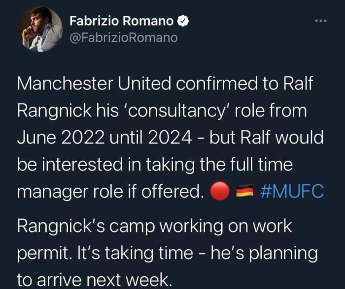 罗马诺表示,曼联已经确认朗尼克将从明年6月开始担任球队顾问,合同到2024年。但如果曼联想让他担任正式主帅,朗尼克也是有兴趣的。