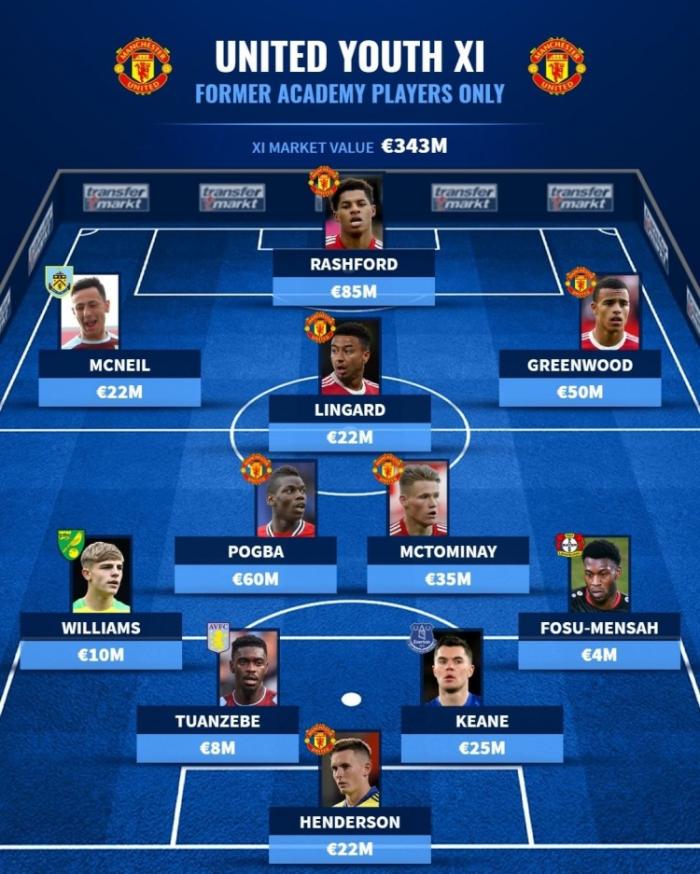 24直播网讯 曾几何时,曼联的卡灵顿训练基地是欧洲最好的青训基地之一,这里涌现出来过许多优秀的球员。而最近这些年来,曼联的青训营虽然不如以前了,但是依然有不少优秀的球员。而近日,德国权威媒体《转会市场网》就盘点了曼联青训的现役最佳阵容,这个阵容总价3.43亿欧元,拥有博格巴、拉什福德等诸多球星,就是不知道这个阵容是什么水平呢?