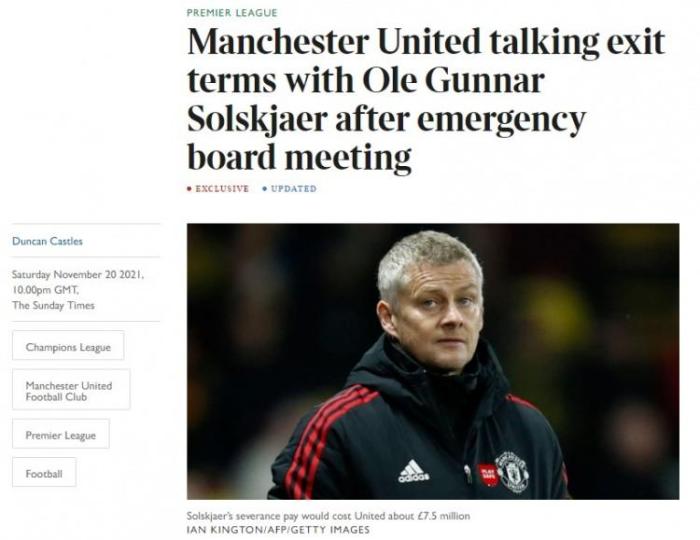 24直播网11月21日讯 据《泰晤士报》记者邓肯-卡斯尔斯报道,在今天凌晨1-4惨败沃特福德后,曼联高层召开了紧急会议,并决定解雇索尔斯克亚,索帅将拿到大约750万英镑的解约金。
