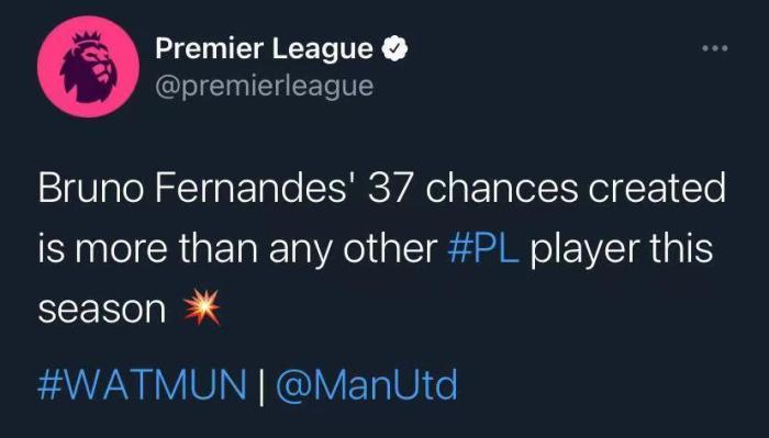 24直播网11月20日讯 曼联将在本轮英超客场挑战沃特福德。赛前,据英超官方统计,B费本赛季创造机会数为英超球员第一。