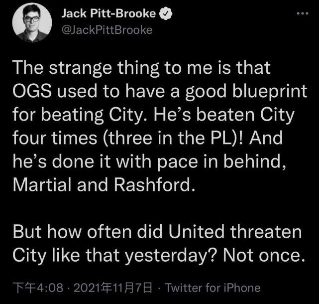 对此Jack Pitt-Brooke为索尔斯克亚打抱不平道:“索帅本有一套能击败曼城的方略。此前他曾四次战胜曼城(3次在英超联赛中),他利用拉什福德和马夏尔的速度曾经起到了很好的效果。但令人奇怪的是,索尔斯克亚并没有用类似的方法,再次冲击曼城。”
