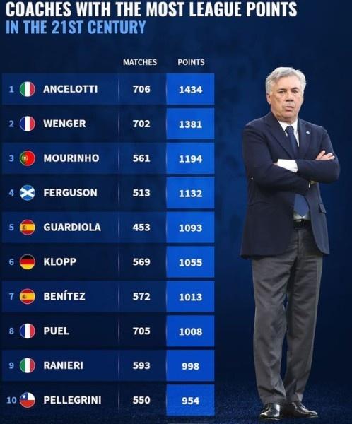 如图,其中安切诺蒂在本世纪带队踢了706场联赛,拿到了1434分,是所有主帅中拿分最多的。而排名第二的则是温格,温格在本世纪带队踢了702场联赛,拿到了1381分,而排名第三的是穆里尼奥,他带队踢了561场联赛,拿到了1194分,第四的是弗格森,他带队踢了513场联赛,拿到了1132分,第五是瓜迪奥拉,他带队踢了453场联赛,拿到了1093分。这里说一下,因为计算的是本世纪的,所以弗格森上世纪拿到的联赛积分没有统计在内。