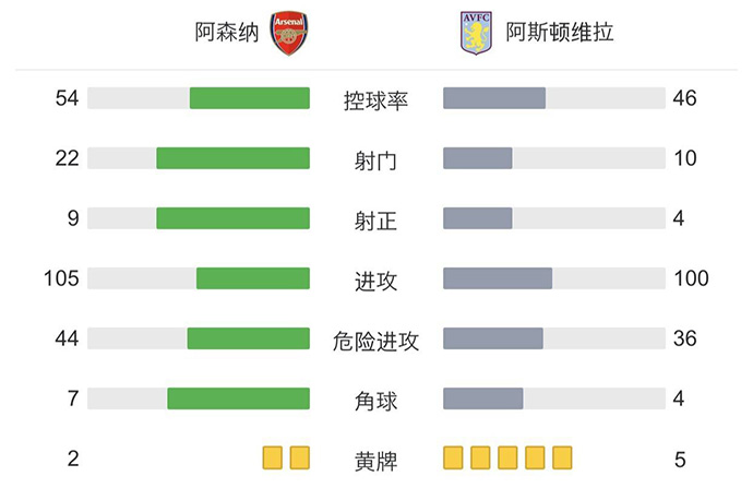 第90+4分钟,阿斯顿维拉前场右侧任意球,莱昂-拜利左脚直接打门,稍稍高出。全场比赛结束,最终阿森纳主场3-1击败阿斯顿维拉。