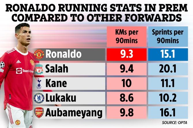 专家认为,C罗跑动不多,影响了曼联的高位逼抢。但事实上,C罗的跑动确实不多,却也不是最少的。其英超场均跑动为9.3公里,平均一场比赛冲刺15.1次。