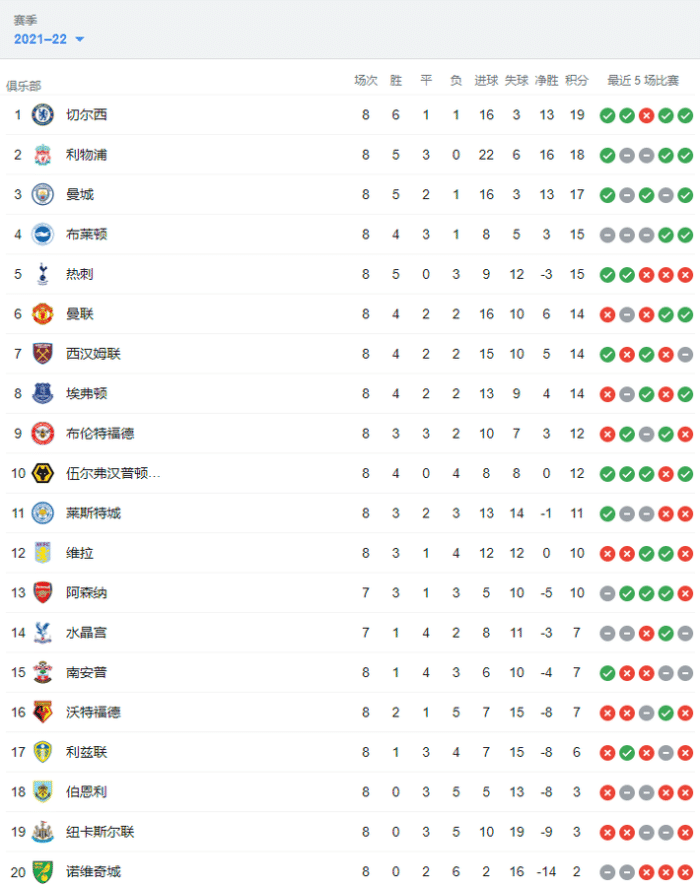24直播网10月18日讯 英超联赛最新积分榜,切尔西19分领跑,曼联客场输球后跌出前四。