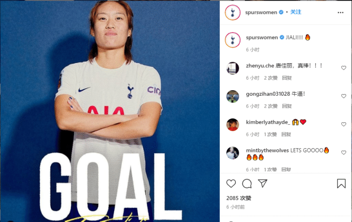 赛后热刺女足官推晒出唐佳丽的照片,并写道:“JIALI!!!!”