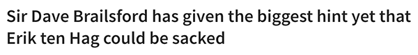 24直播网01月09日讯 曼联新老板吉姆·拉特克里夫爵士的亲信戴夫·布雷斯福德爵士,已经连续观看曼联的3场比赛,据多方报道,布雷斯福德暗示曼联主教练滕哈格有可能会下课。