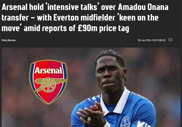 24直播网01月09日讯 据比利时记者 Sacha Tavolieri 透露,阿森纳正在就埃弗顿中场阿马杜-奥纳纳的转会进行密集谈判。