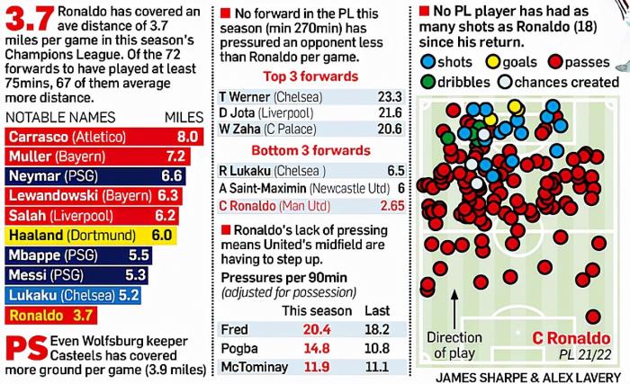 不过,尽管C罗的斗志不需要怀疑,但他已经36岁高龄,为了保证在进攻中的能量,防守方面投入已经不大。数据显示,曼联7号是英超迄今射门最多的球员,共有18脚射门,其中主要都在禁区内完成。然而与此同时,C罗在英超和欧冠的跑动距离都低于前锋均值。