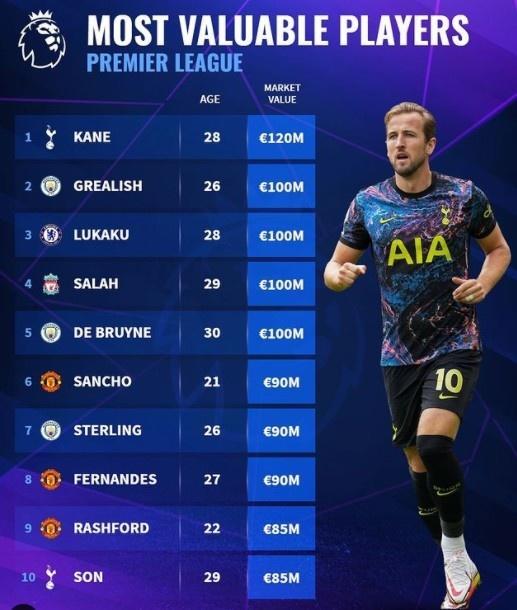 24直播网10月10日讯 德国转会市场网今日更新了英超球员身价,凯恩1.2亿欧元全联赛第一。