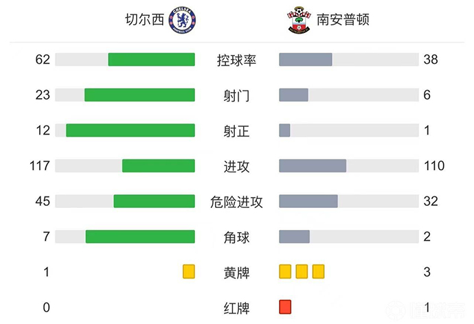 24直播网讯:北京时间10月2日22:00,英超第7轮,切尔西坐镇主场迎战南安普顿。上半场,小查洛巴头球破门首开记录,麦卡锡多次作出扑救,卢卡库进球被吹,维尔纳头球破门被吹。下半场,沃德-普劳斯点射破门后染红离场,维尔纳破门再次领先,奇尔韦尔破门扩大比分,全场比赛结束。切尔西3-1南安普顿。