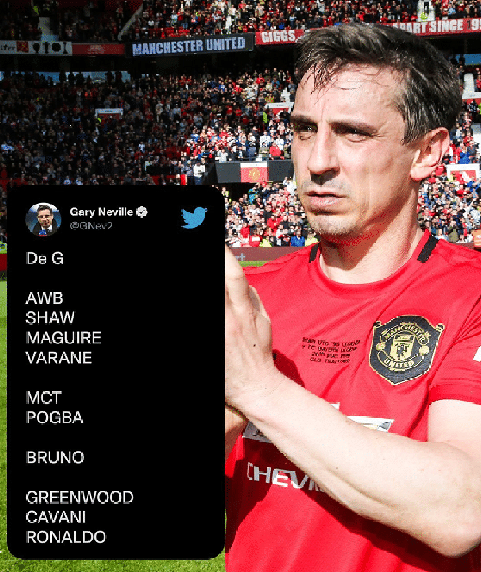 内维尔给出的建议是踢4231阵容,其中门将位置上依然是德赫亚,而后防线上四人组则是比萨卡、瓦拉内、马奎尔和卢克肖;中场双后腰是麦克托米奈和博格巴,前腰位置上是B费,而前场三叉戟C罗和格林伍德在两侧,卡瓦尼在中路。这是内维尔给出的建议,不过个人认为,这样排兵布阵真的不怎么样啊,如果真的用这套阵容去踢,估计曼联会很困难。