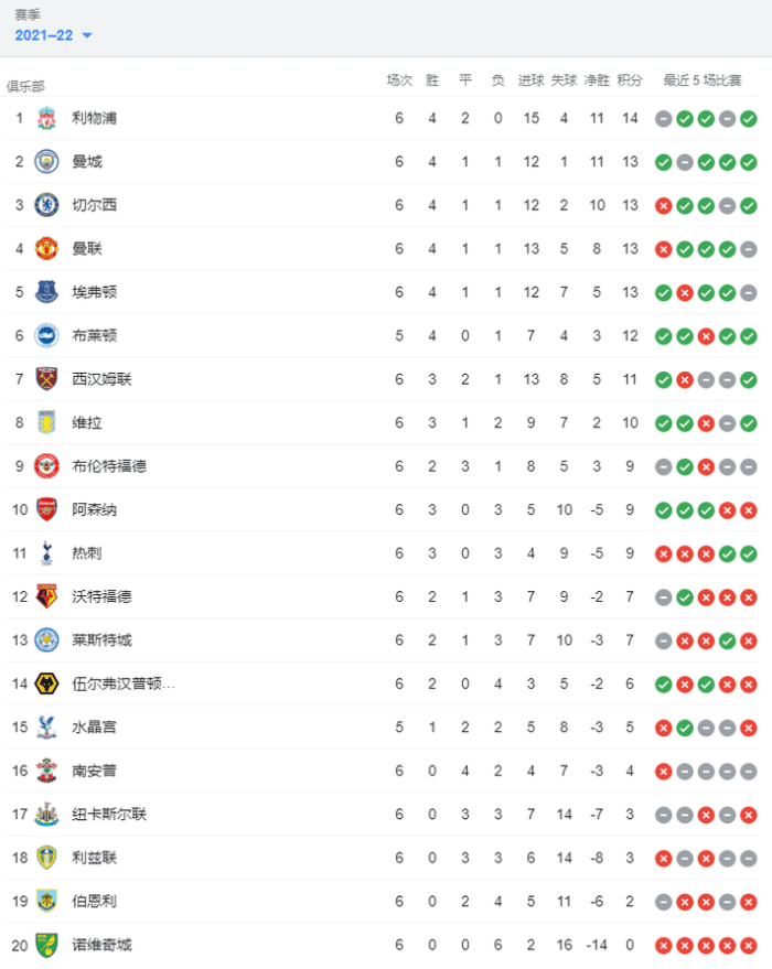 利物浦本轮3-3平布伦特福德,6战4胜2平积14分排名第一,曼城在1-0击败切尔西后与曼联、埃弗顿和切尔西同积13分,因净胜球优势升至英超第二,切尔西、曼联和埃弗顿分列三至五位。