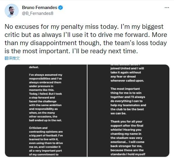 24直播网9月26日讯 消息,B费对维拉罚丢点球后在推特上发文,表示自己失点没有借口,而这次经历会激励他继续前行。