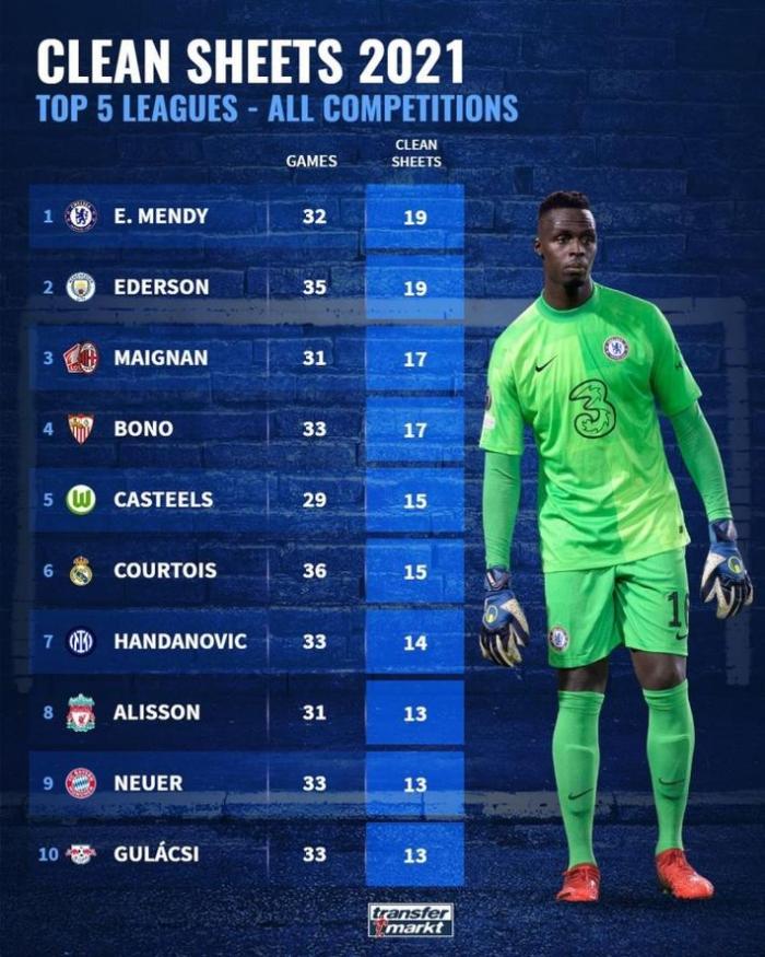 1.E-门迪,切尔西,32场19次零封