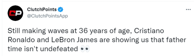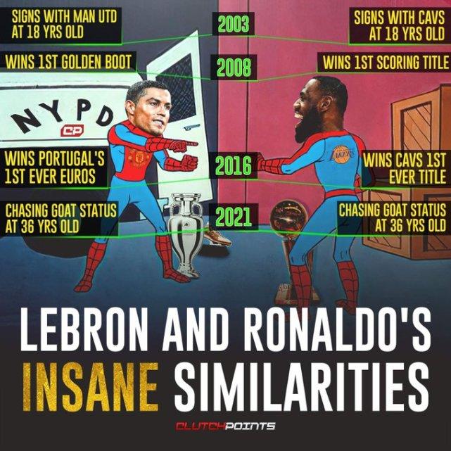 24直播网9月12日讯今日,美媒ClutchPoints晒出詹姆斯与足球超级巨星C罗职业生涯轨迹对比图,感慨两位传奇老将之间的一些惊人相似之处。ClutchPoints还配文写道:“36岁的克里斯蒂亚诺-罗纳尔多和勒布朗-詹姆斯仍在掀起波澜,他们告诉我们,时光老人并非不可击败。”
