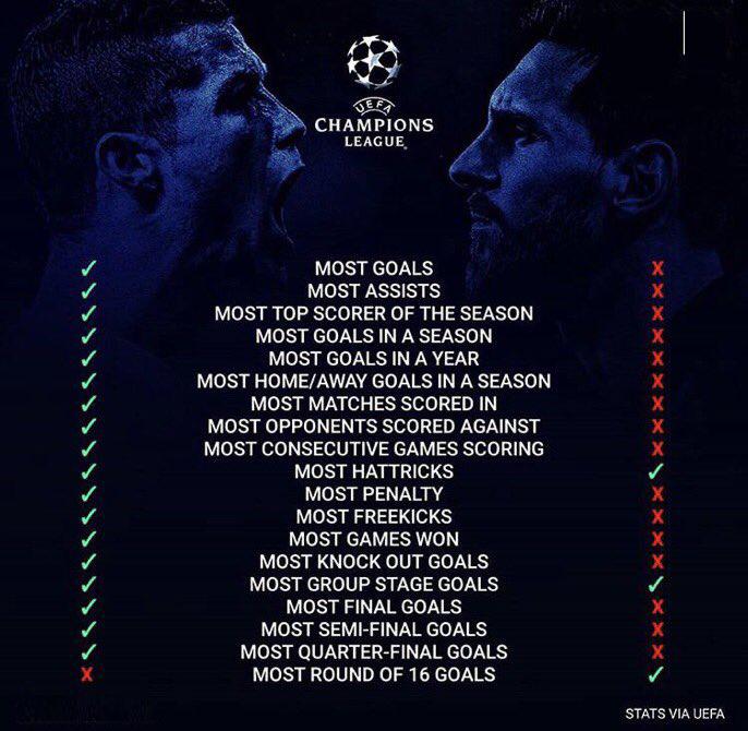 C罗在3个不同的联赛赢得7次冠军,加上在皇马和曼联的5次欧冠,因此这一环节领先于梅西。