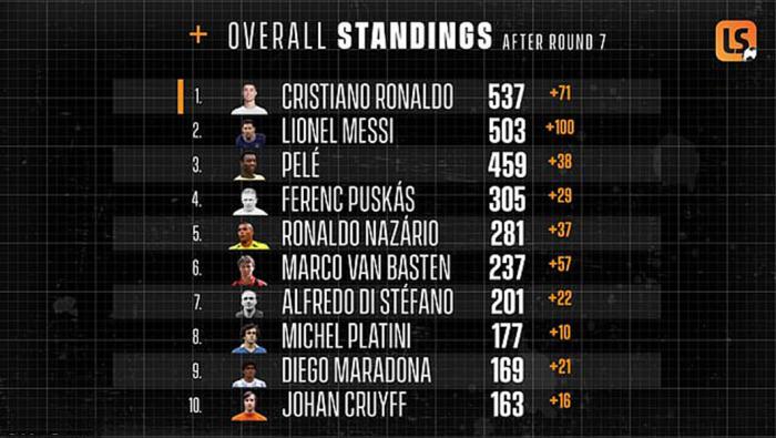 要入选这份计算名单,球员需要至少赢得两次金球奖,或者在1956年之前被公认为最伟大的球员。最终,C罗、梅西、贝利、马拉多纳、范巴斯滕、克鲁伊夫、普斯卡茨、迪斯蒂法诺、罗纳尔多和普拉蒂尼进入了10人对比名单。