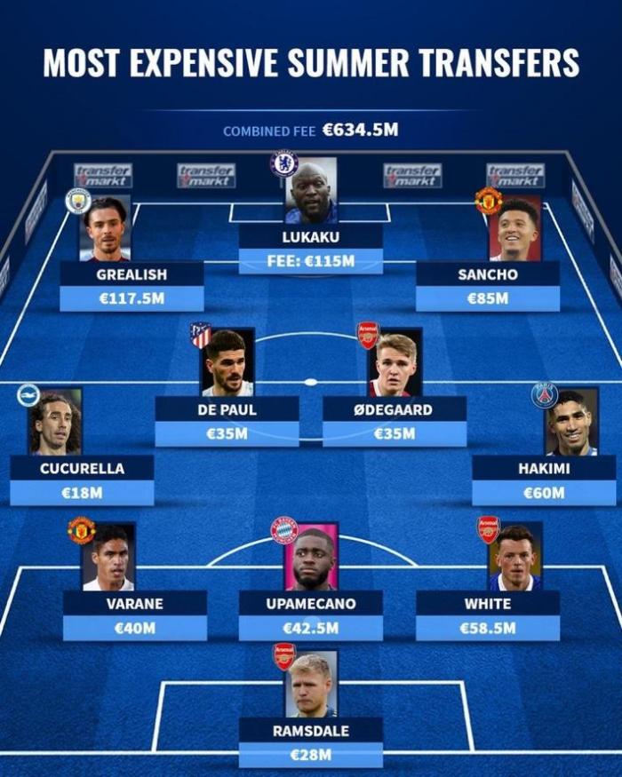 前锋:格拉利什(1.175亿欧,维拉→曼城),卢卡库(1.15亿欧,国米→切尔西),桑乔(8500万欧,多特→曼联)