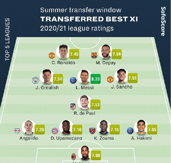 如图,Sofascore是按照各大球员上赛季的场均评分进行评选的。其中,门将位置上是米兰新援迈尼昂;后防线上分别是巴黎后卫阿什拉夫,西汉姆后卫祖马,拜仁后卫于帕梅卡诺和莱比锡后卫安赫利尼奥;中场分别是马竞的德保罗,巴黎的梅西,曼城的格拉利什和曼联的桑乔。而前锋是曼联的C罗和巴萨的德佩。当然,除了这些球员以外,还有很多其他球员没有入选。