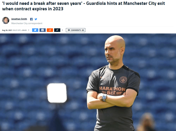 24直播网讯 据进球网报道,瓜迪奥拉表示自己想在2023年与曼城的合约到期后休息一下,他称自己接下来可能会执教国家队。