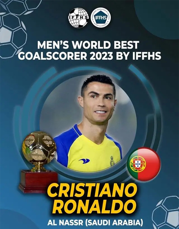 24直播网01月02日讯 IFFHS(国际足球历史和统计联合会)官方消息,C罗在2023年打入54球当选年度最佳射手!姆巴佩、哈兰德各打进52球分列二三位!这是C罗获得的第9个IFFHS奖项,C罗曾获得IFFHS评选的2013、2014、2016、2017、2019年的世界最佳国家队射手王和2014、2015、2020年的顶级联赛射手王。