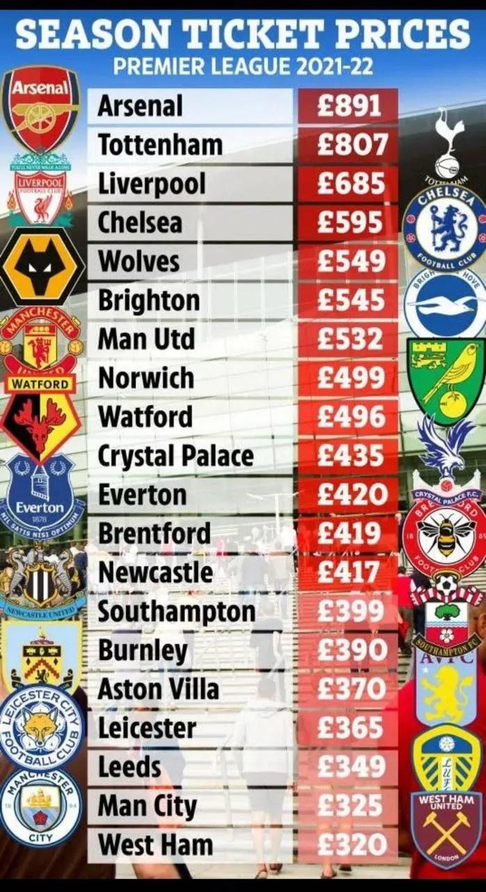 如图,新赛季阿森纳的季票价格是891英镑,是所有球队中最贵的,当然这也是意料之中的事情,毕竟阿森纳一直都是英超季票价格最贵的球队,在温格时期就是这样。一来,阿森纳球迷不少,二来伦敦的消费也稍高不是。而排名第二的同样是来自伦敦的球队,他们是热刺,热刺季票的价格是807英镑,热刺票价高,是从最近几年开始的,球队战绩一好,列维马上就开始涨价了。