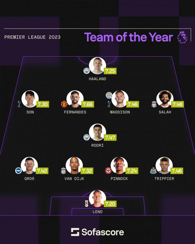24直播网12月30日讯 Sofascore根据球员评分列出了2023年英超最佳阵容,B费当选最佳球员 哈兰德、孙兴慜入选。