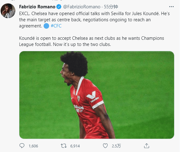 24直播网讯 7月27日记者罗马诺消息,切尔西已经就法国后卫孔德的转会和塞维利亚开启了官方谈判。