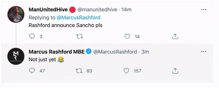 在与球迷互动时,有人要求曼联妖星宣布桑乔到来,拉师傅最初的回答非常得体:「还不是时候。」