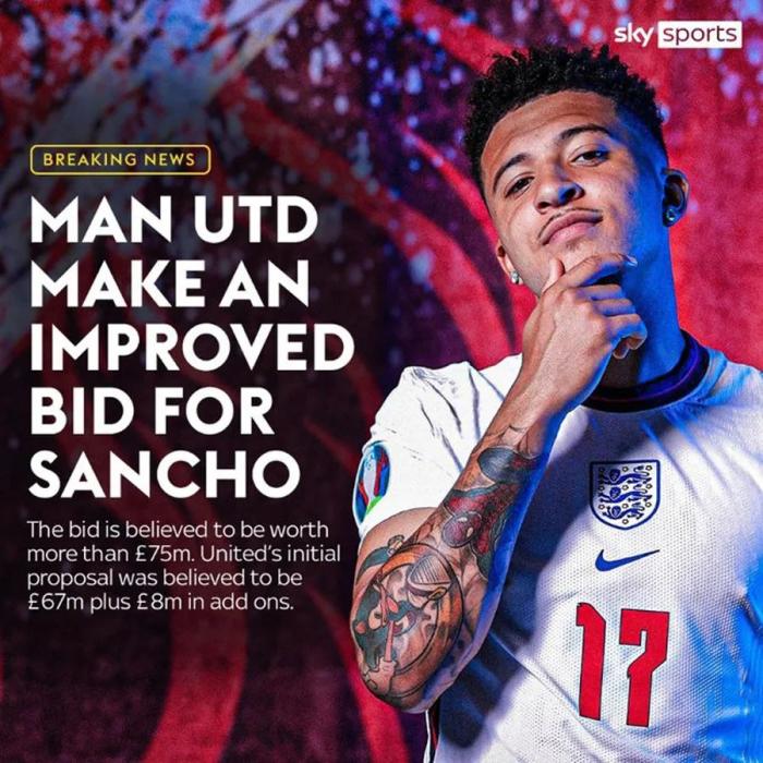 24直播网讯 据包括天空体育在内的英媒报道,曼联第二次向多特蒙德报价求购桑乔,出价至少超过了7500万英镑,比本月初被拒绝的6700万英镑固定金额+800万英镑浮动条款有明显提升。