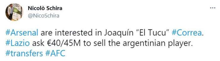 24直播网讯 据知名记者尼科洛-斯基拉报道,阿森纳有意阿根廷攻击手华金-科雷亚,拉齐奥方面要价4000万-4500万欧元。