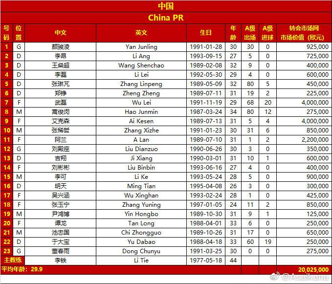 门将:1-颜骏凌、12-刘殿座、23-董春雨