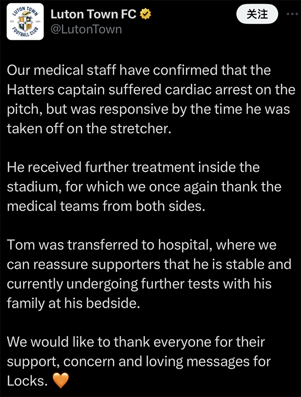 为此,卢顿俱乐部感谢了双方的医疗团队,并且代表洛克耶和他的家人,感谢谢大家对洛克耶的支持、关心和爱的信息。