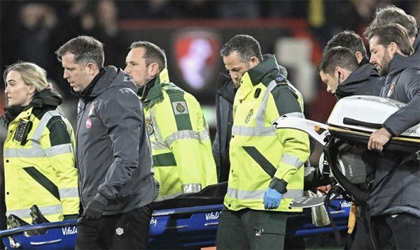 身旁的伯恩茅斯球员比林迅速示意队医进场,并且赶忙上前查看洛克耶情况,随后当值主裁立即吹停比赛,两队队医也冲进场对洛克耶进行紧急处理。
