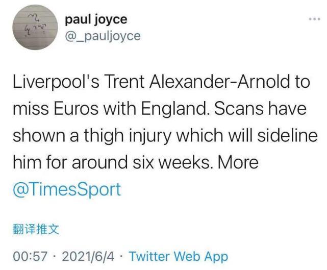 在此前英格兰与奥地利的热身赛中,代表英格兰首发出场的阿诺德,在比赛第88分钟无对抗的情况下拉伤了大腿,他主动做出了换人的手势。随后阿诺德在队医的搀扶下,一瘸一拐的离开了球场。
