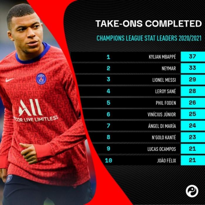 过人榜:姆巴佩过人37次排名榜首,内马尔过人33次排名第二,梅西过人29次排名第三,随后是萨内的28次,福登的26次,维尼休斯的25次,迪玛利亚的24次,坎特的23次,奥坎波斯和菲利克斯的21次。坎特进入欧冠过人榜了,不知道他是否要感谢一下萨里呢?当初可是萨里把他放到前腰位置上的。